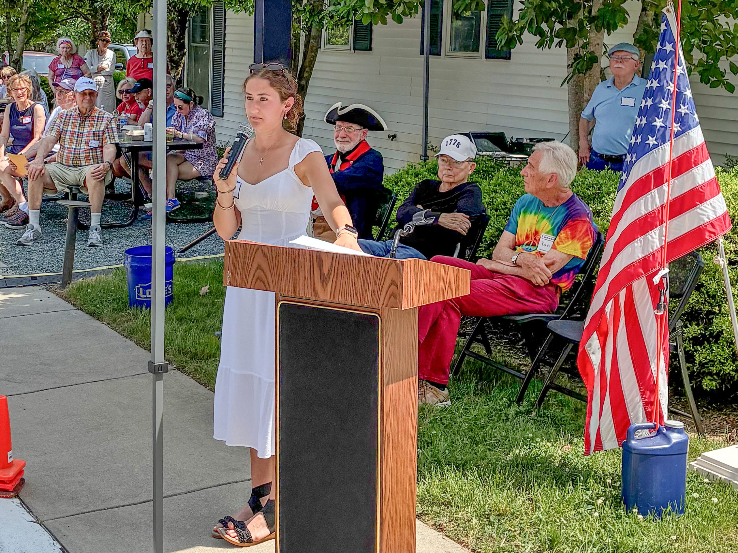 General Francis Nash Chapter Rumbaugh Oration Winner Giuliana Greto, a Sophomore at Seaforth High School, delivered her oration at the Fearrington Village America 250 Celebration on April 25. Pictured behind her in Continental Uniform is Compatriot Chris Palmer.